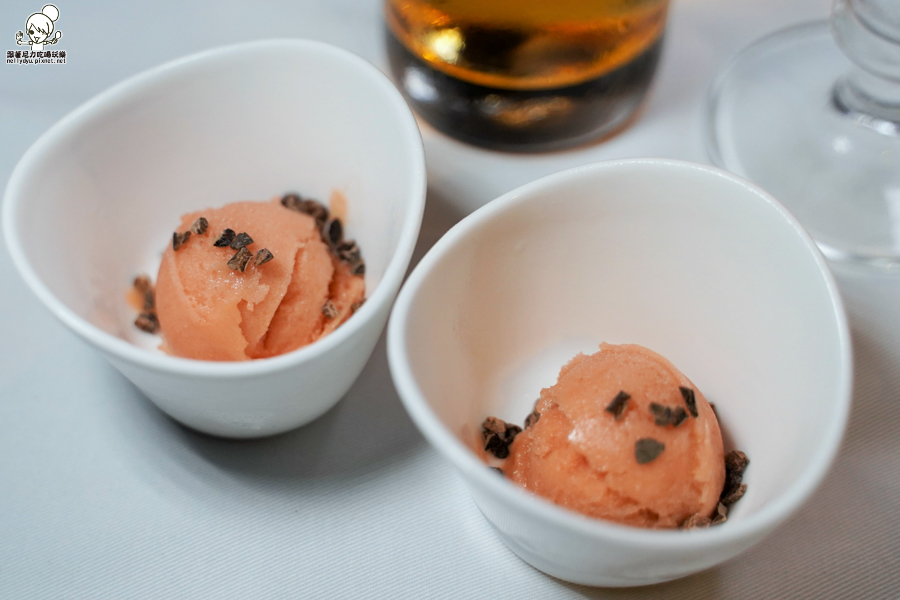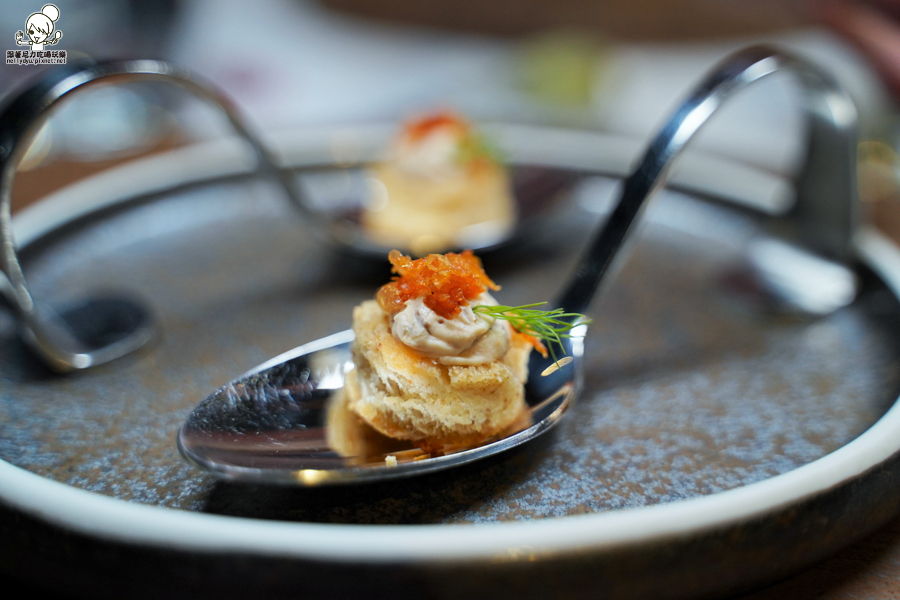 開胃菜使用東港櫻花蝦,底下帶有麥香餅乾的脆度