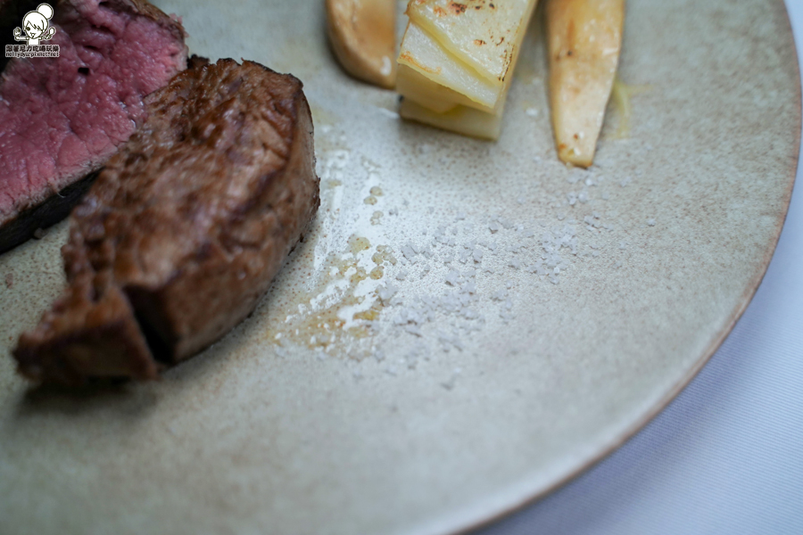 沾一點海鹽提味,讓菲力帶有甜味、鹹香好吃