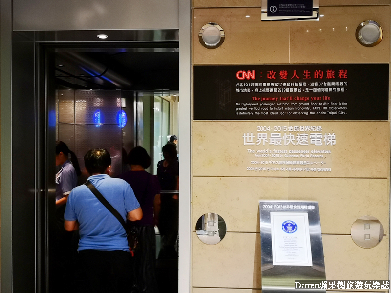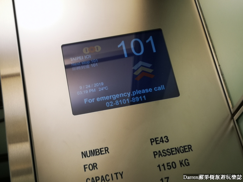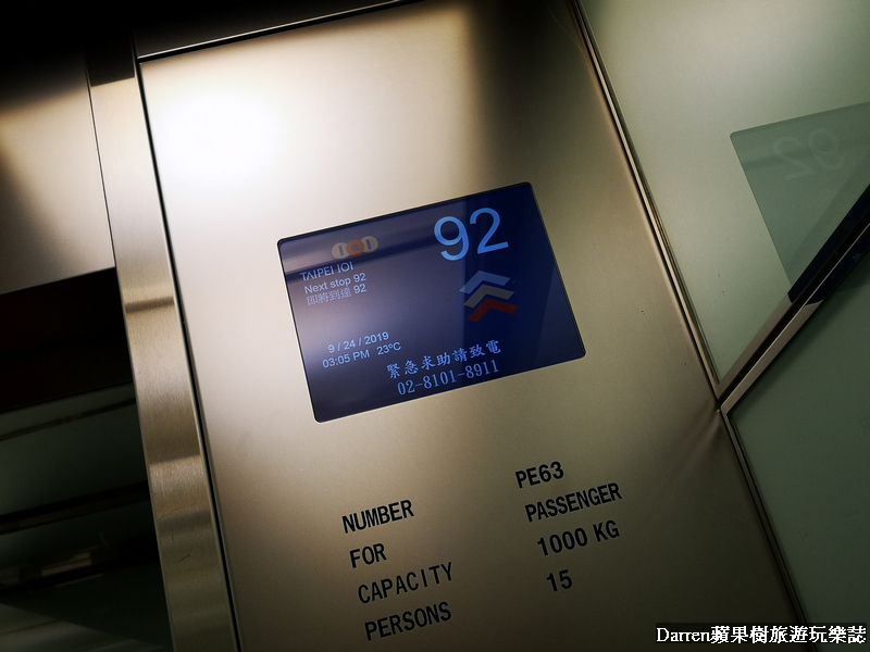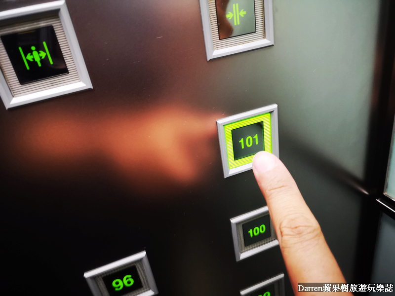 防護裝備都好了之後,就搭電梯到93樓,再轉乘101樓層的電梯,如此頻繁換電梯主要是要避開101的風尼球空間,電梯會出現101按紐,工作人員會讓大家按下101樓