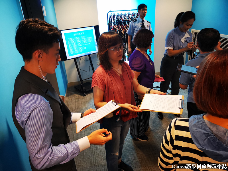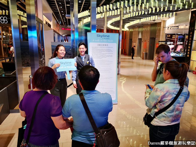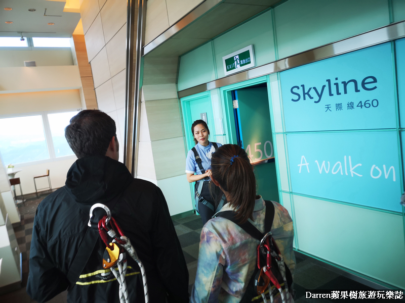 體驗Skyline要在體驗前30分鐘前報到,報到地點在5樓的101觀景台櫃檯旁邊,會有手拿Skyline牌子的工作人員,出發前工作人員會簡介一下Sky460體驗流程以及注意事項,彙整一下注意事項就是拍攝器材包括手機和相機都必須要使用繫繩等避免掉落,工作人員也會提供手機防墜套給大家,另外腳架、自拍棒、gopro等禁止攜帶至101樓層,身高體重限制有身高低於145公分、體重低於30公斤或超過120公斤者,無法參與活動,還有高風險疾病例如:心臟病、高血壓、腦溢血、氣喘、癲癇患者,以及處於懷孕、飲酒、宿醉狀態中的人,也沒辦法參與體驗活動