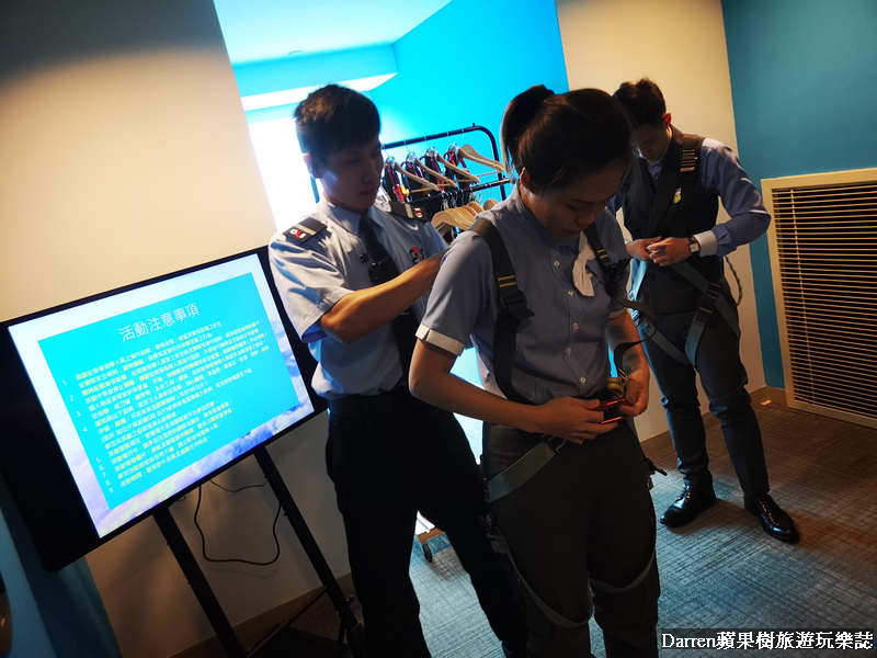 再來就是要穿戴防墜裝備,工作人員會協助穿上防墜裝備,並教大家如何繫緊身上的裝備衣