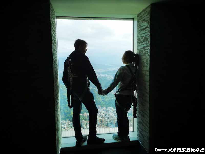 逛完SKYLINE 460就要回去卸身上裝備,工作人員分享到這個窗戶可以拍照剪影也很美,大家又開始瘋狂拍照起來