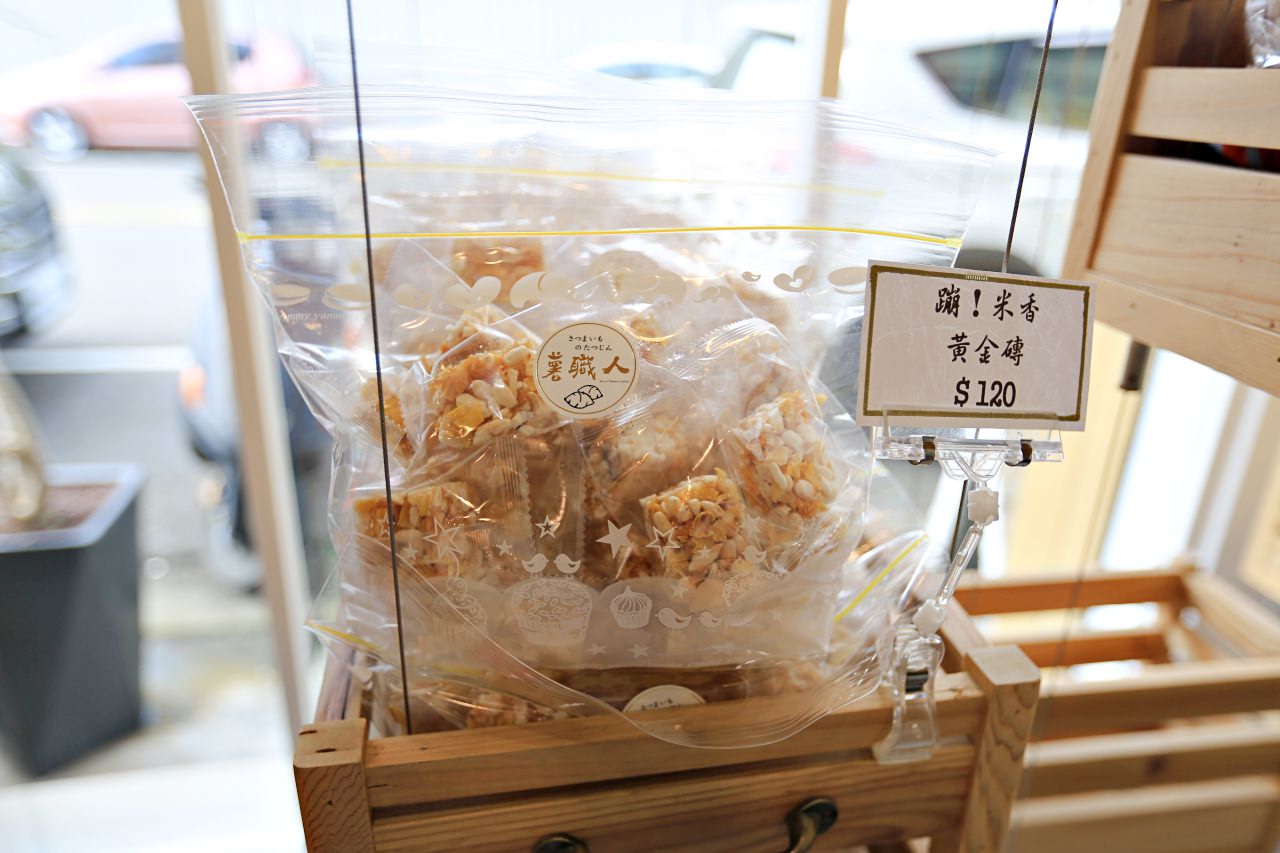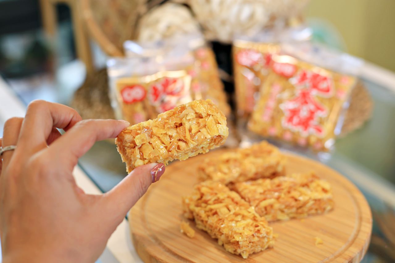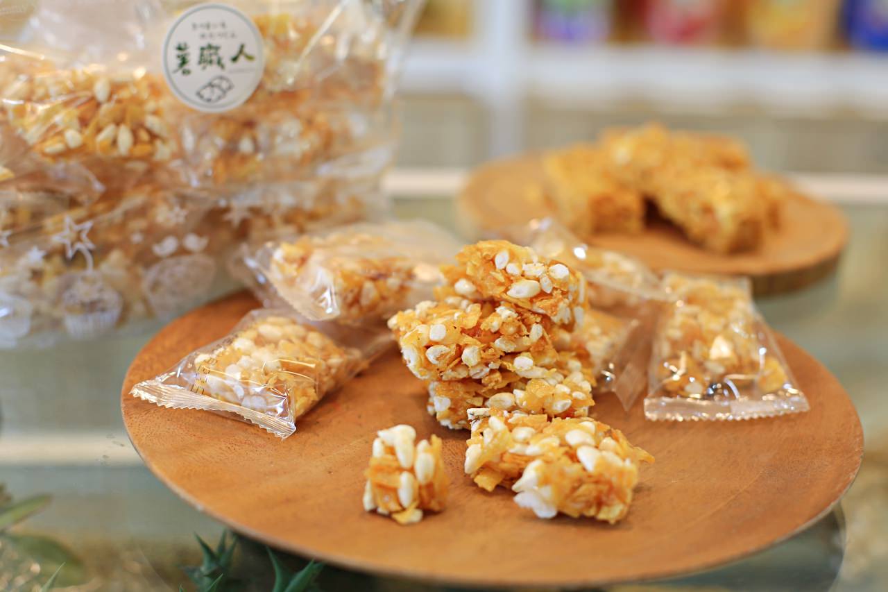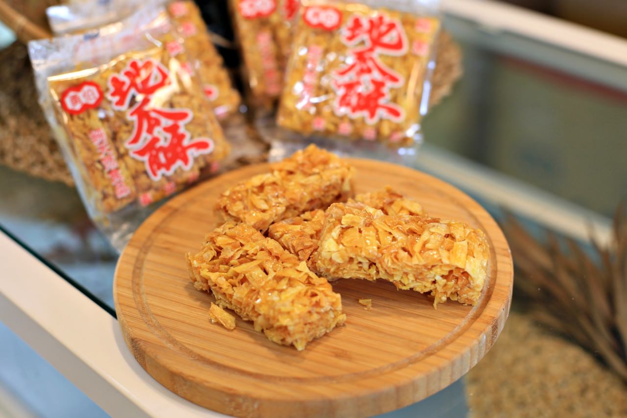 把傳統的地瓜酥加入創意元素,取用同樣懷舊的「蹦米香」,蹦出全新滋味的黃金磚,咬下去酥脆的地瓜酥甜味帶著蓬鬆米香口感,讓傳統零食多了年輕創意。討喜的小方磚送禮非常適合,據說吃米香也有好運的含義喔,老闆更特地研發酥脆跟鬆軟兩種口感,可以依照喜好選擇。