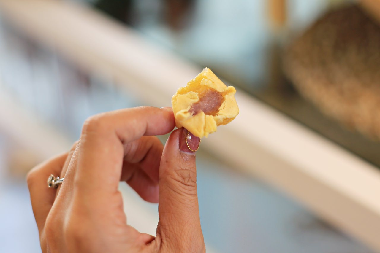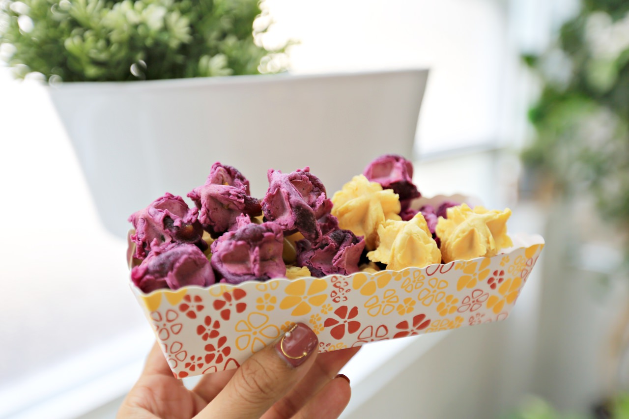 一口一顆造型可愛的鬆餅球是用黃地瓜、紫地瓜做成包餡的小球,放進烤盤裡熱壓成型,原本只有在新光三越快閃店才有機會吃到,現在直接到店裡也可以享用喔。一點也不油膩的地瓜球口感Q彈,微甜地瓜內餡讓整顆地瓜球鬆餅香氣更加奔放。