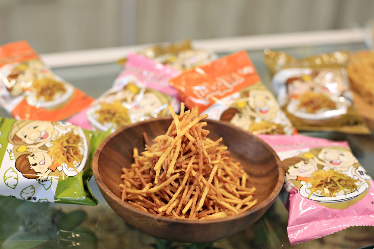 除了經典地瓜酥,勇伯最新推出的超細的地瓜薯條「瓜瓜脆」,名字很可愛,當然也好吃涮口,可以說是台版的薯條三兄弟,有原味、甘梅、胡椒鹽、芥末椒鹽四種口味。