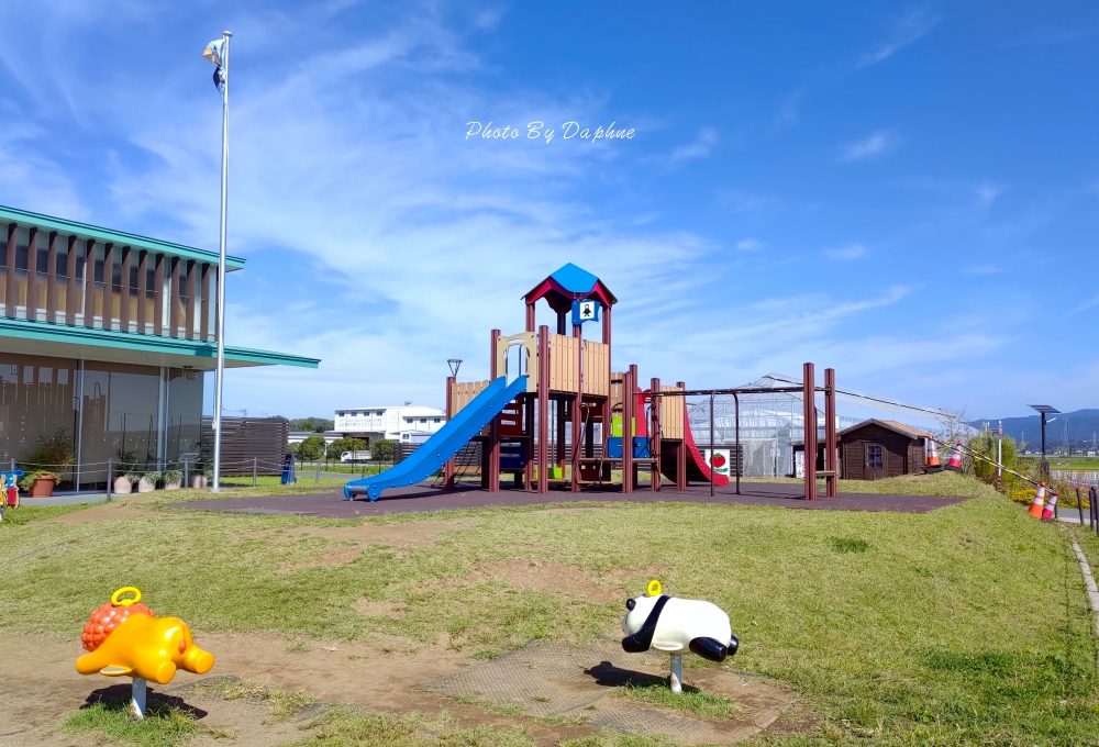 休息站外備有戶外座位與遊戲設備,當乘車時間太久,提供小孩放風奔跑的空間。