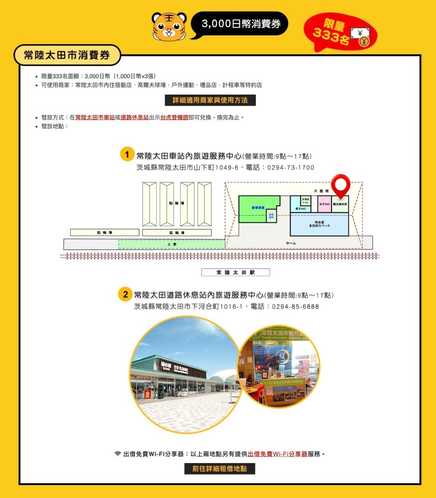 前往常陸太田道路休息站觀光案內所領取消費券,記得一併租用免費的WiFi分享器。除了常陸太田道路休息站可租借,另外還有兩個租借處,而且能在機場歸還。