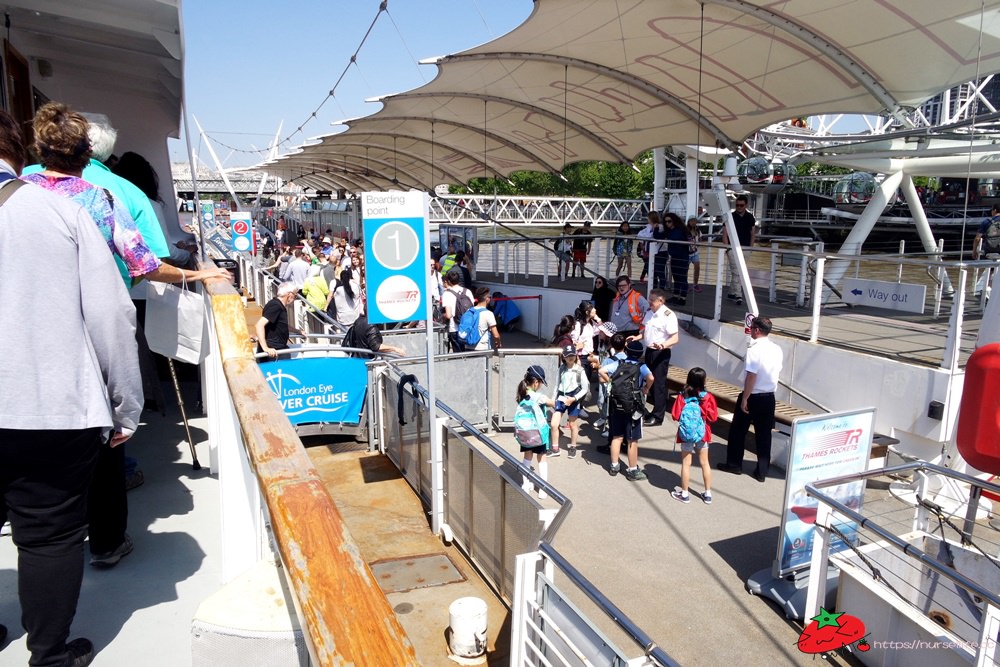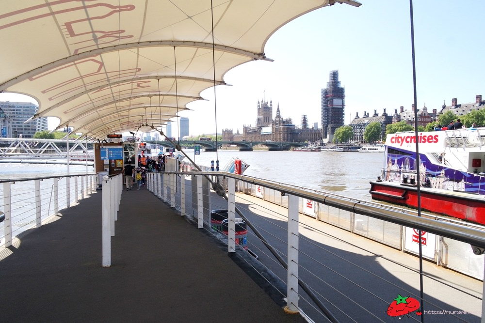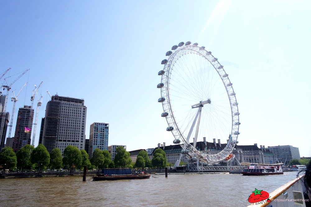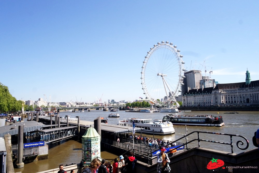 再往旁邊的橋墩走,就能看到倫敦眼在你眼前,泰晤士河旁邊有許多遊船,價位都不太一樣,還有一些是遊船+下午茶,很是愜意!