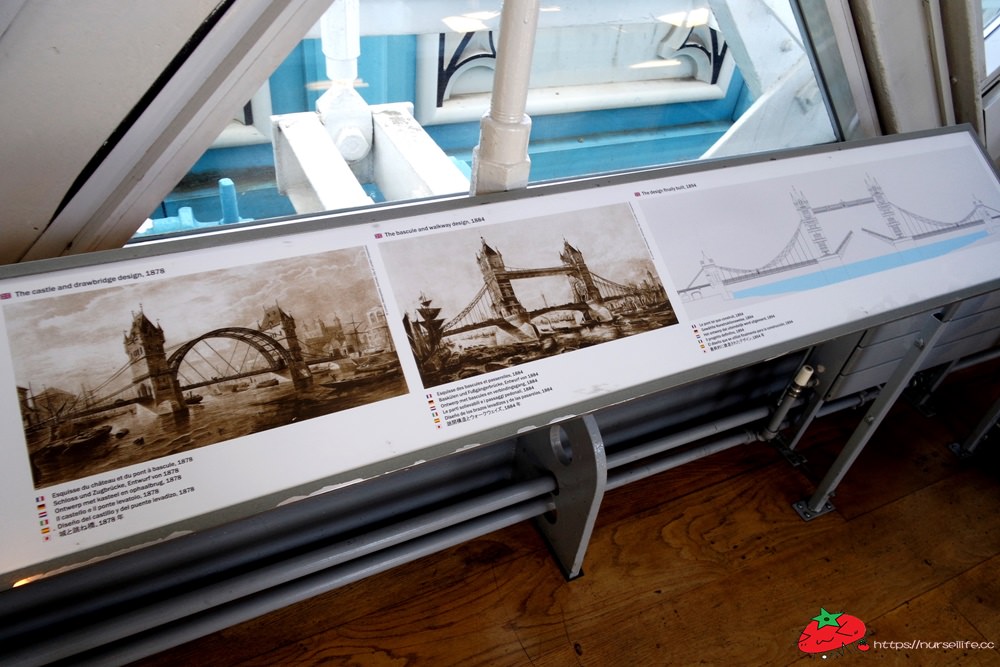 除了可以往下俯瞰之外,塔橋內還有放倫敦塔橋的設計概念圖跟建築歷史。