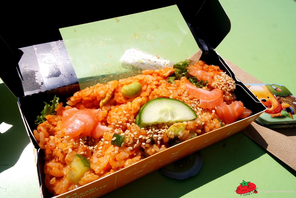 可能一個太興奮玩得太開心,肚子有點餓,在路邊餐車買了鮭魚醋醬拌飯,坐在河畔公園旁邊吃,我的旅途就是這麼隨興自在。