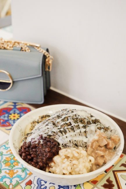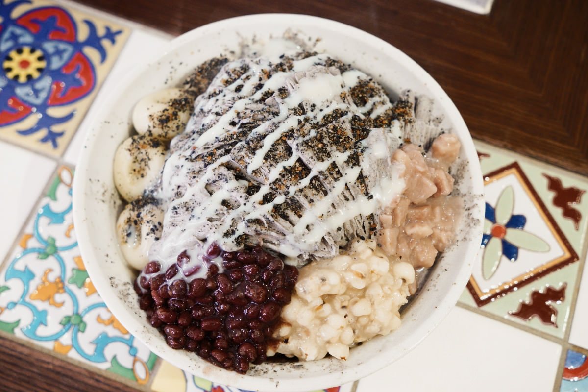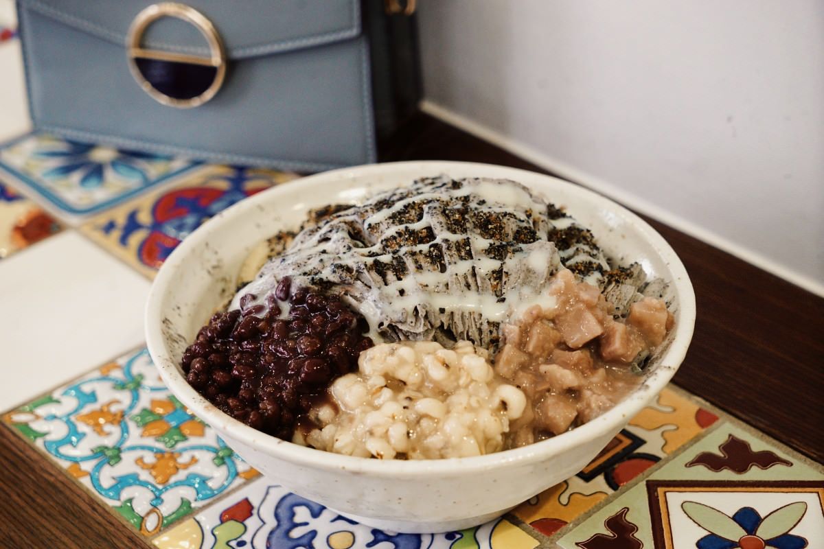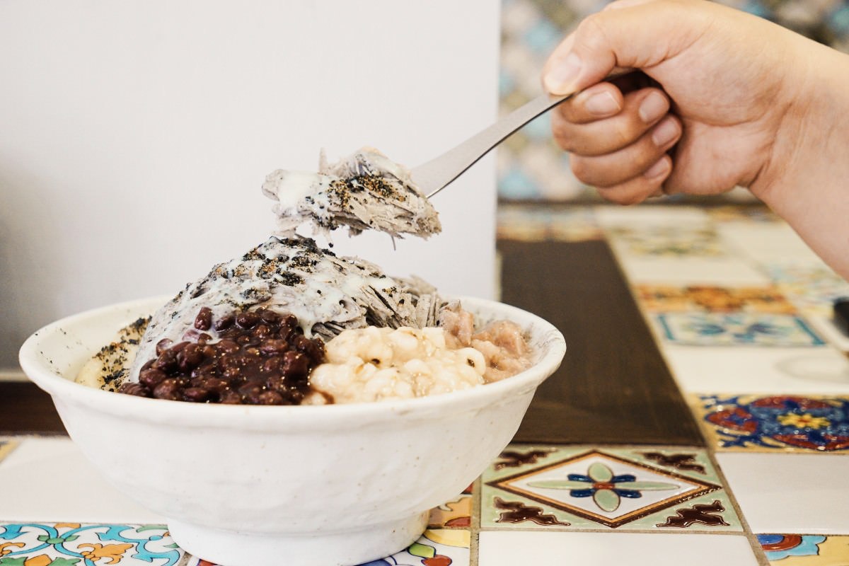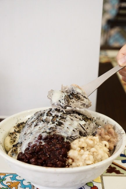 有著三顆白玉加上我們選了紅豆、薏仁、芋頭,配料豐富。看著店員捧上這一碗滿滿的黑芝麻雪花冰真的很特別!我第一次吃到黑芝麻口味的雪花冰,撒上黑芝麻、淋上煉乳,香氣十足又不過於甜膩,份量剛剛好,不會覺得太多或太少。