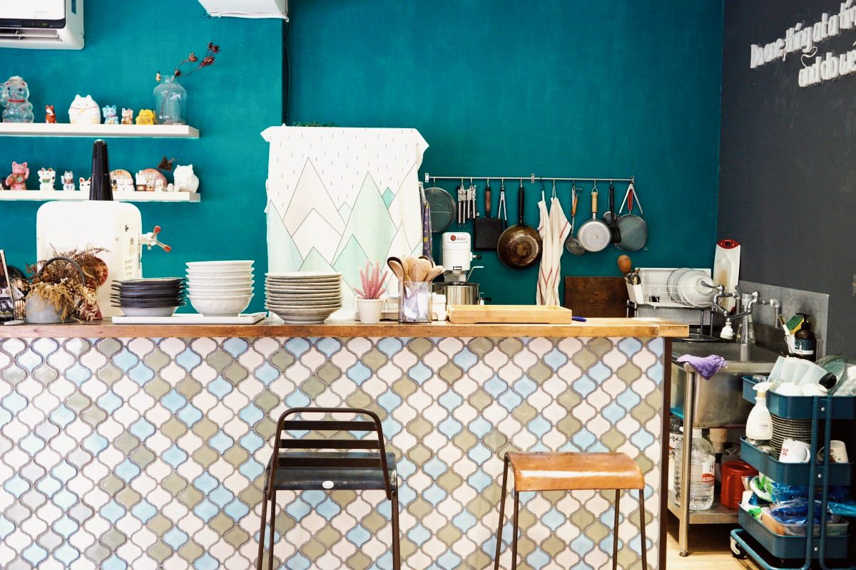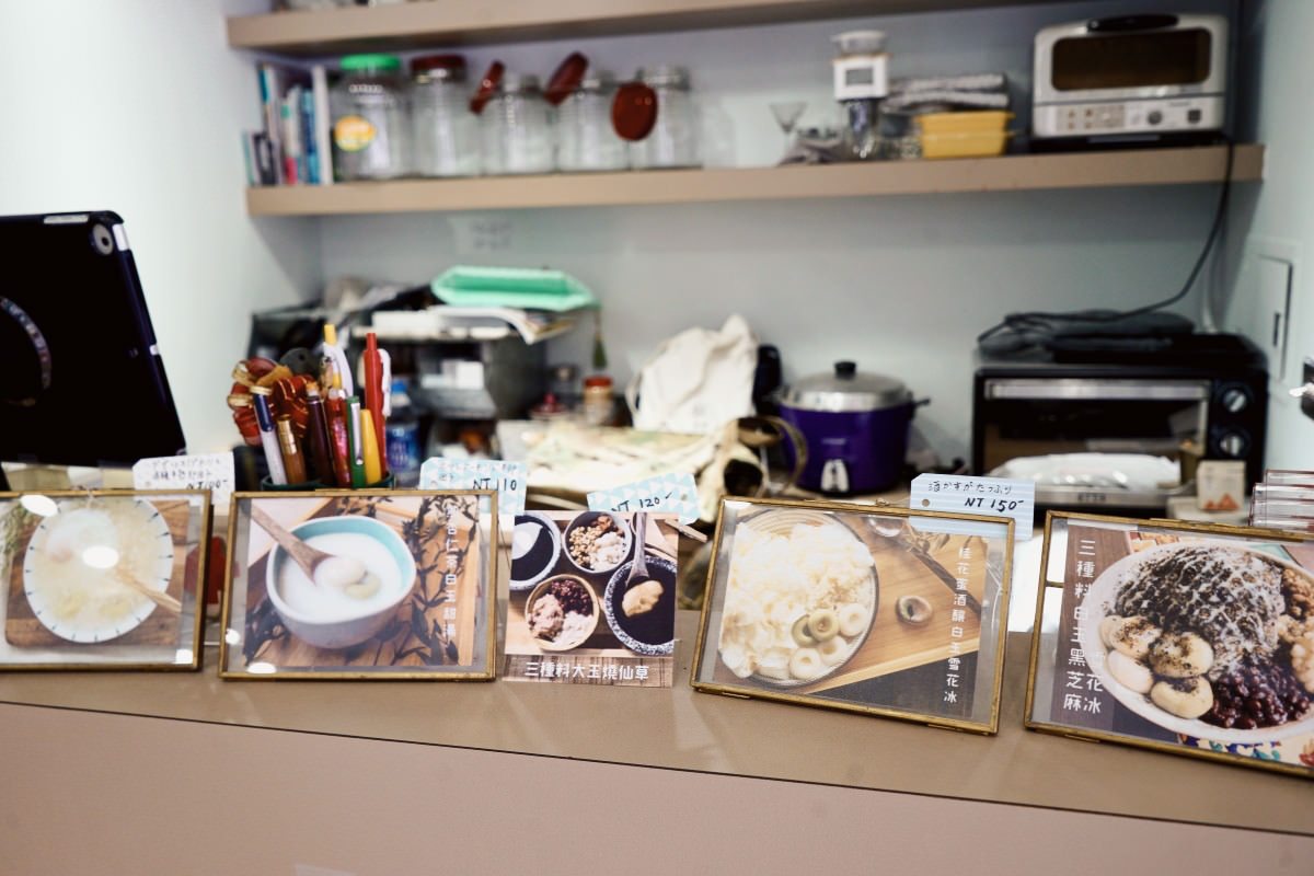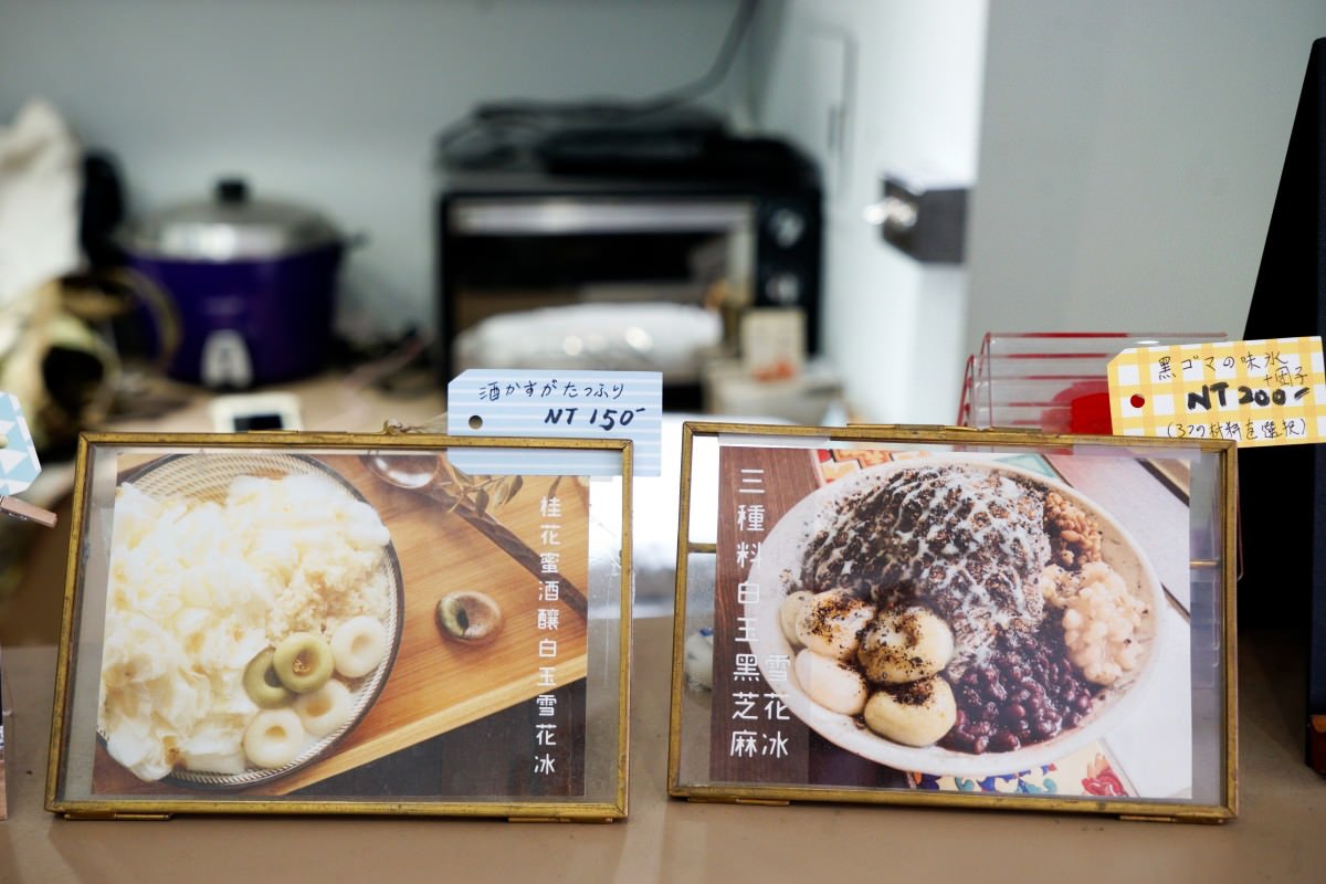 三角窗的店面空間,位子沒有特別多,中間圍著圓柱繞一圈的小座位、面窗位子、窗邊兩桌,旁邊有販售雜貨小物。吧台後方刷著藍綠色的牆面,有著清新舒爽的感覺,加上門外掛著冰字的旗幟,走進店內又聽著日本女孩聊著天,好像來到日本卡通裡的世界。