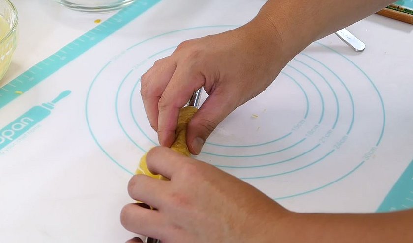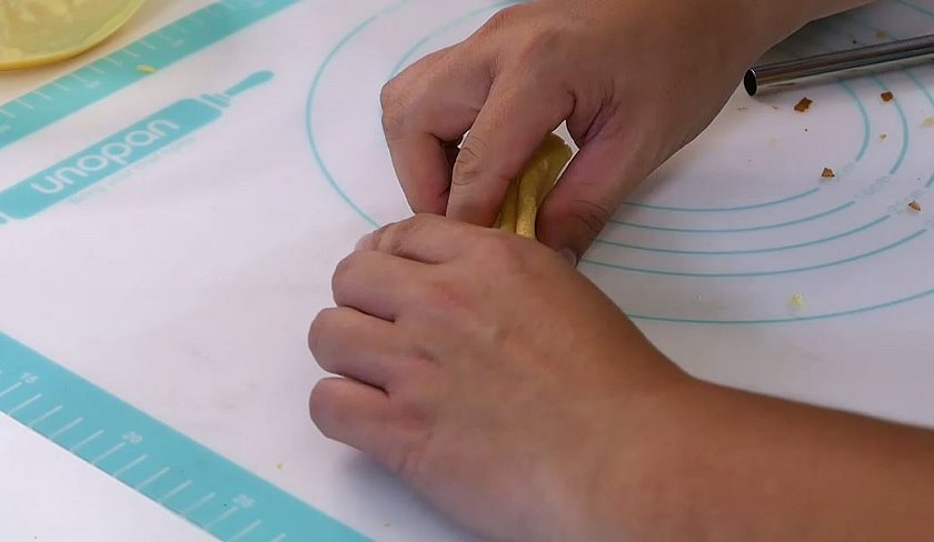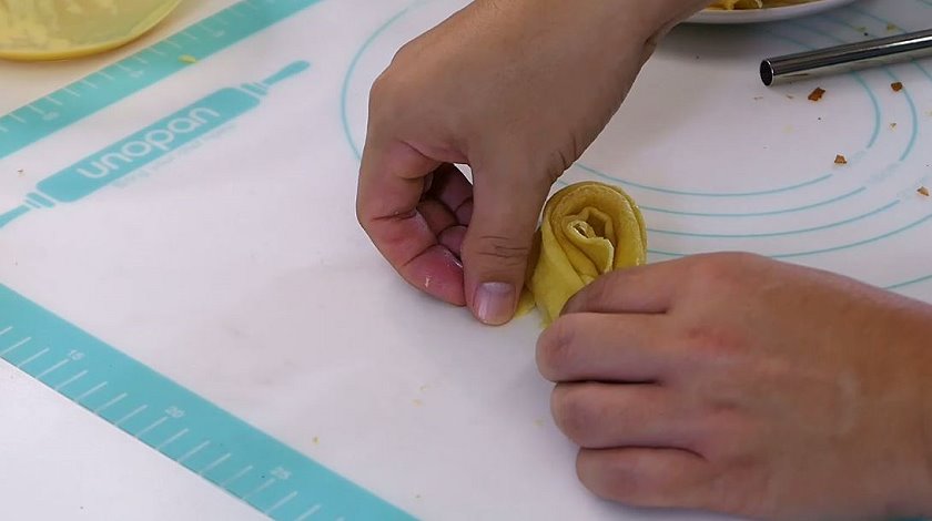 ▼起鍋的蛋捲皮要趁熱(記得戴手套,我不怕燙例外,哈!),把蛋捲皮擠壓成細條狀~