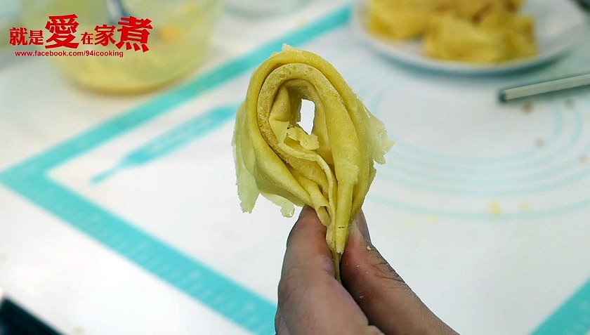 ▼我自己試作了五、六次,大約用兩湯匙把蛋捲皮壓成大約一個手掌大來製作比較剛好。