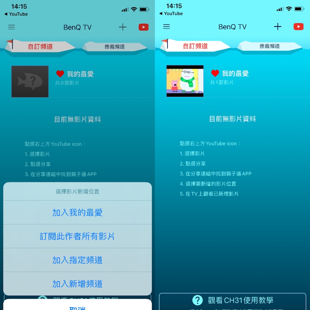 最後選定影片要新增的位置,就能直接透過分享的方式,將 YouTube 上的影片加入親子通 App 囉!
