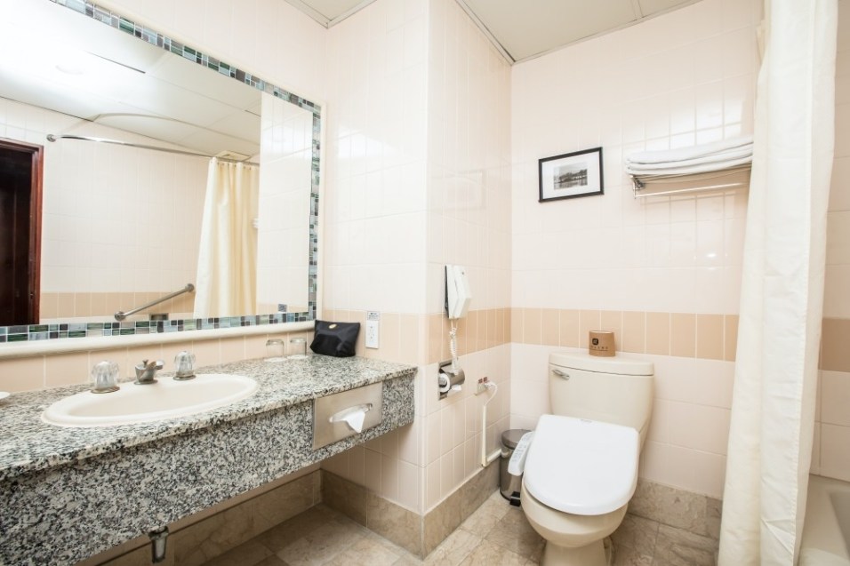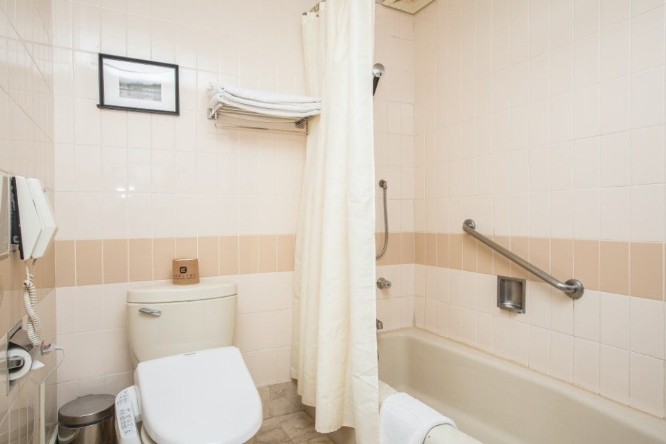 再來,是配置簡單明瞭的衛浴空間,浴缸與免治馬桶都是標準配備,的確很有體貼感