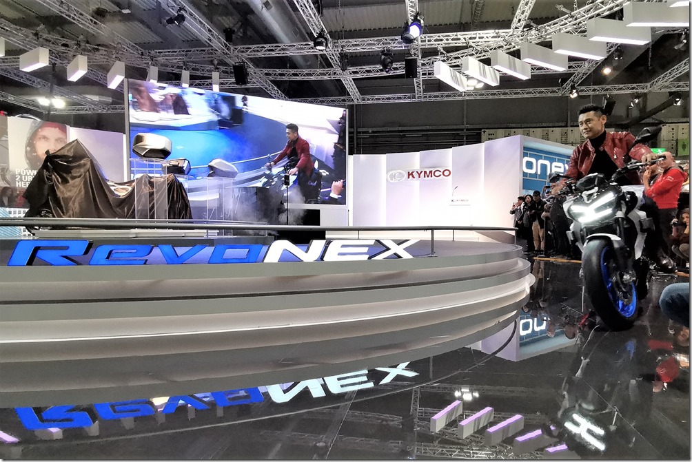 在米蘭車展光陽記者會中,最令人印象深刻的一幕即為光陽董事長親自騎著 RevoNEX 繞行會場,宣示著 RevoNEX 的開發現況,這是從一個傳統的速可達品牌進入到重型機車的關鍵畫面。柯董對於能在會場中以實際騎乘展示電動重機是一個里程碑,也想讓大家親眼目睹電動車的優勢,他特別說明在慢速行駛時,電動重機可展現低速時的電門操控與大扭力,在騎上展示台的斜坡時就有明顯的感受到更為輕鬆。
