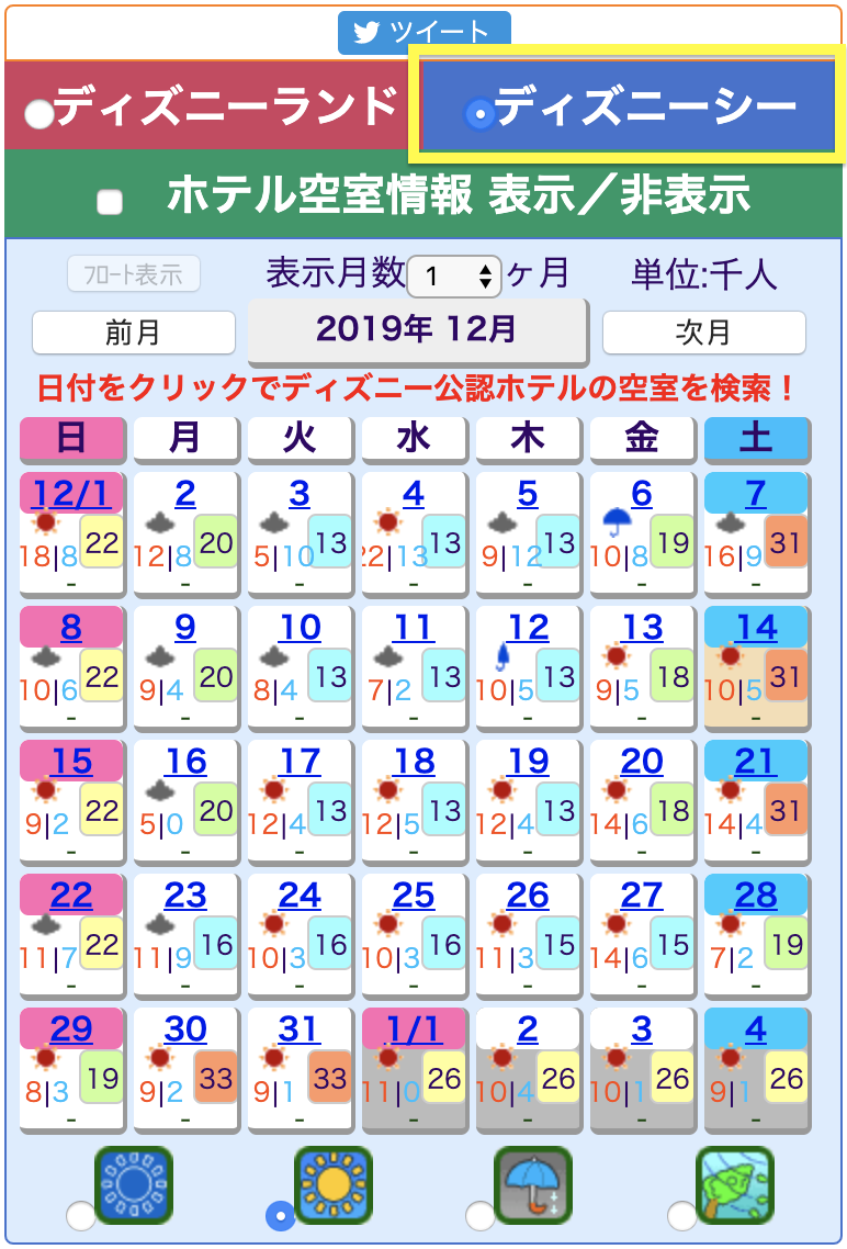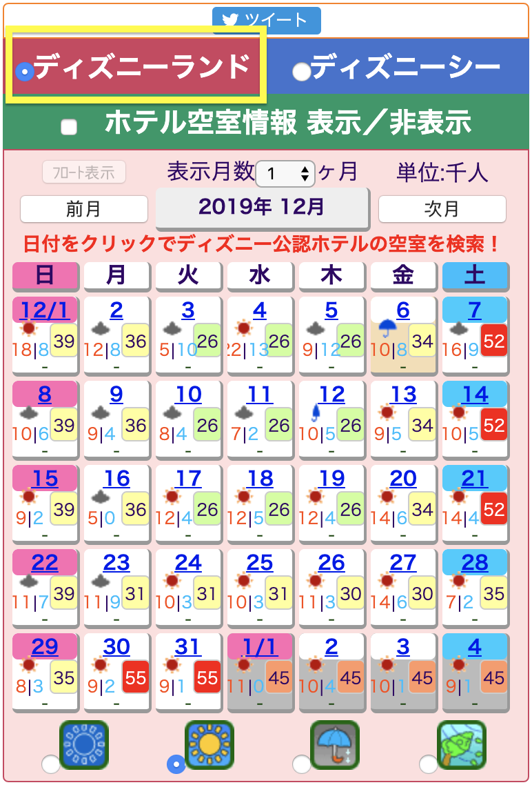 範例:假設我要12/12~17去東京玩,那我就會挑12/13、14、15最少人的三天,其中12/13陰天,12/14雨天,12/15、12/16是晴天,所以就是12/15、12/16其中一天安排去迪士尼最安全!