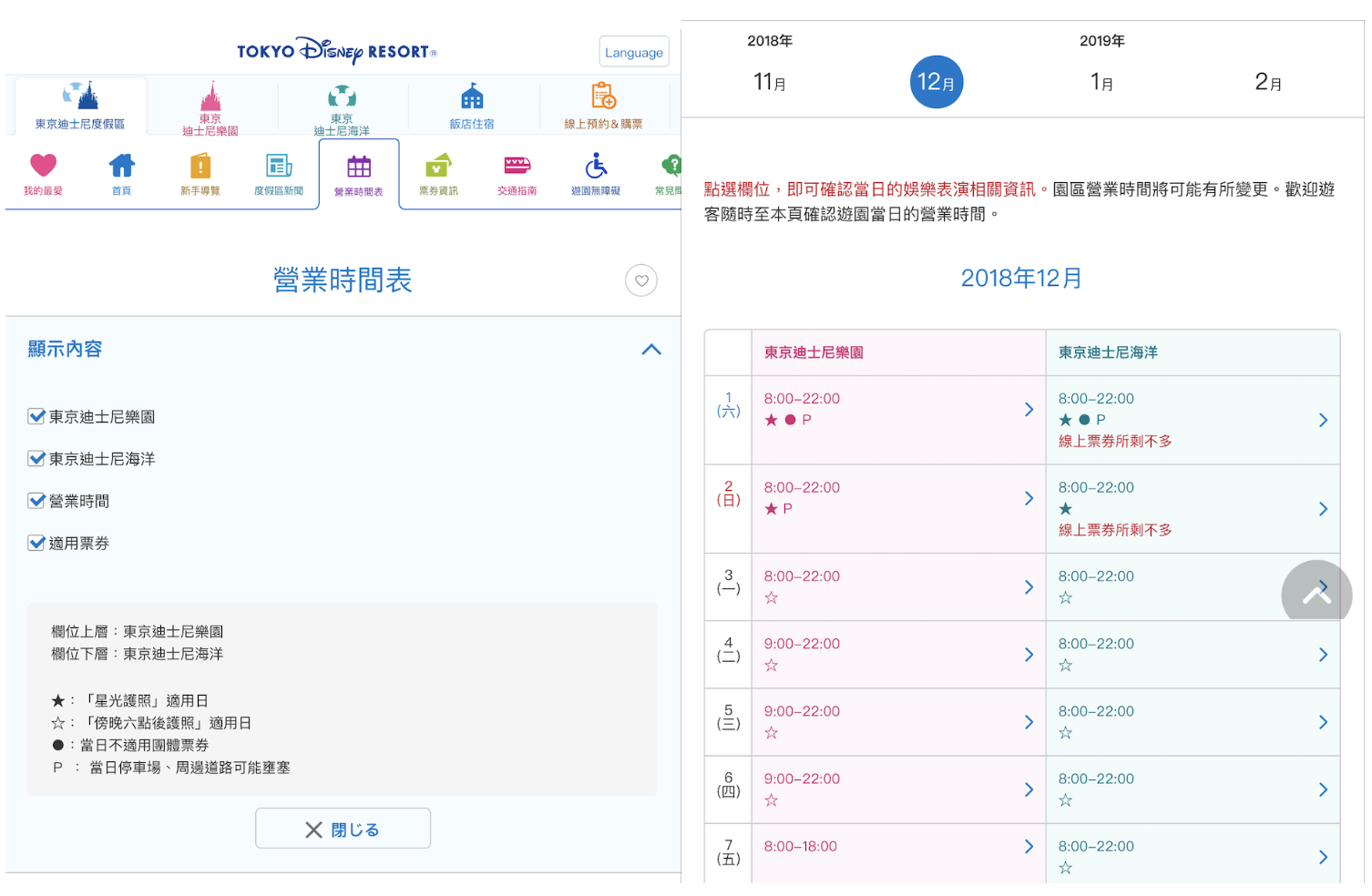 網頁打開會顯示一個月份的月曆,你可以勾選東京迪士尼樂園or海洋,