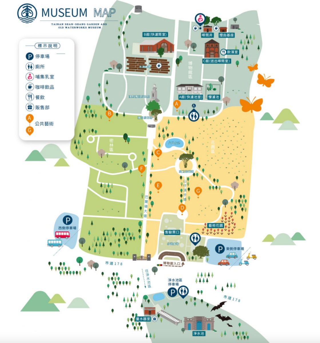 先簡單看看台南山上花園水道博物館園區地圖,整個台南山上花園水道博物館共分成博物館區、淨水池區兩部分,基本上大概在對面,但中間還是隔了約3分鐘車程,大家可以直接開車過去比較不用走那麼久,淨水池區門口也有停車場,會比較方便。