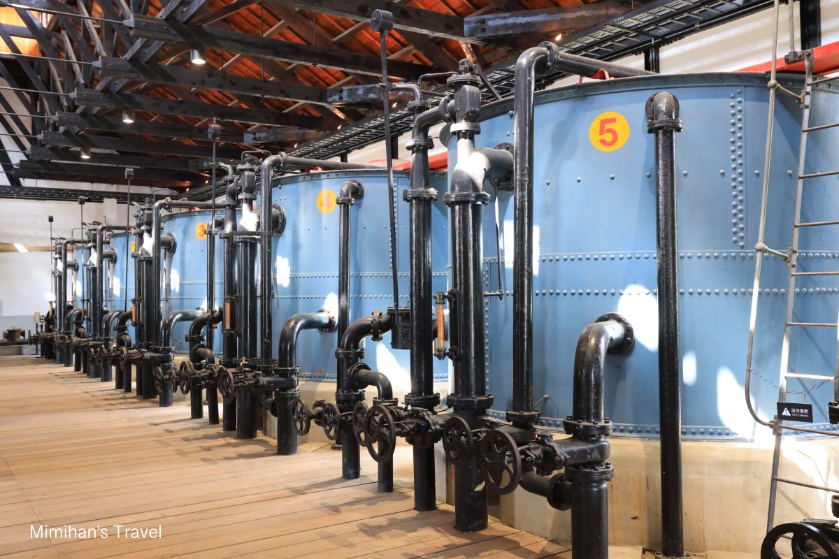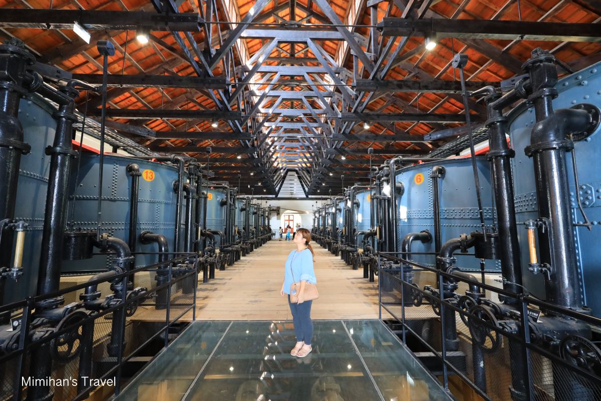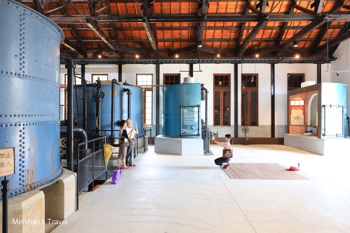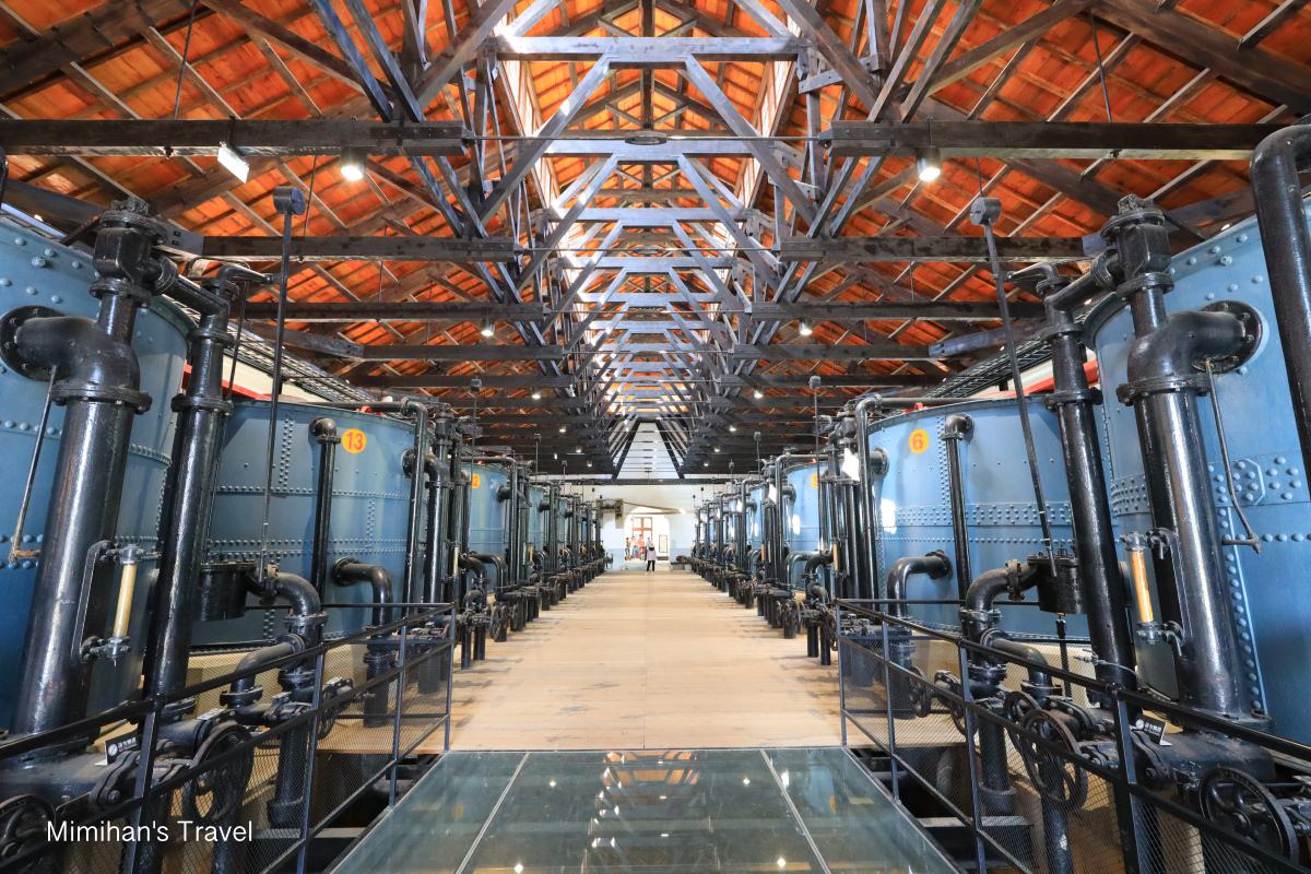 B館快濾筒室是目前最熱門台南IG拍點,原本的機具都還是被保留下來成為山上花園水道博物館的展品,走進大門,兩旁排開共計14座的大型快濾桶,很是壯觀,這些機具是當時都是從英國進口來的,目前看來保存的很完整。屋頂特別的工法,讓室內採光與通風都很不錯。