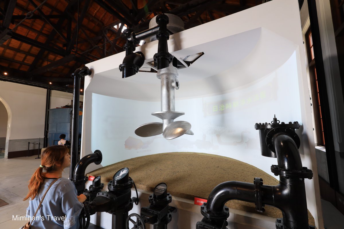 目前裡面整修換然一新,還規劃了水資源觸動互動體驗,雖然不少機具都已經撤除,但館方透過投影重現當時淨水場的運作方式給大家看,這還蠻有趣。
