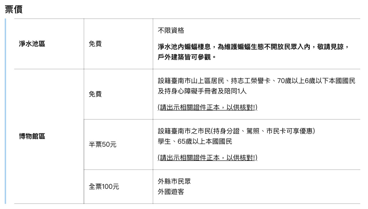 台南山上花園水道博物館門票是全票100元;半票50元,設籍台南市居民符合半價的資格,而對面的淨水池區則是免費參觀。不過淨水池裡是蝙蝠棲息地,每年只有某些時段會開放入內參觀,其他時間就只能在外面拍照。