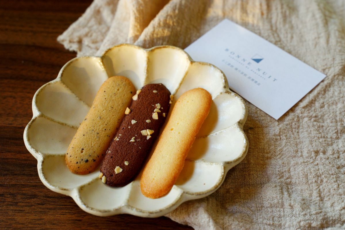貓舌頭餅乾是使用蛋白製作而成的細長形餅乾,表面上會有很多細小的孔洞,就像是貓舌頭一樣。晚安點心坊有三種口味的貓舌頭餅乾,莊園咖啡豆、杏仁可可與大溪地香草口味。大溪地香草口味的貓舌頭餅乾,可以吃到奶香與香草香氣的層次感,清新而耐人尋味。杏仁可可使用法芙娜可可粉製作,增添杏仁粒,也增加了口感與香氣,除了原本的可可香,又多了一些杏仁香。