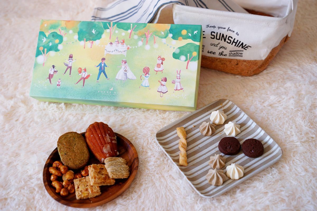 晚安點心坊的喜餅禮盒一樣與 Reiko 插畫師合作設計,繪製出浪漫的婚禮畫面,童趣又帶點浪漫。搭配日本美術紙,設計為長形的禮盒,餅乾吃完也捨不得丟掉,非常值得收藏作為收納盒。