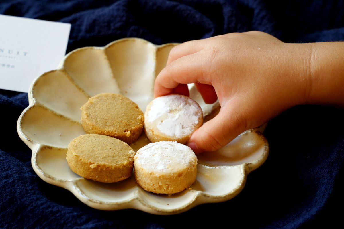 伯爵酥餅與西班牙酥餅口感很特別,一口咬下先是酥脆的口感,入口變感受到柔軟在舌尖蔓延,減糖 20% 的手工餅乾,香氣不減,甜度卻剛剛好。伯爵酥餅帶著淡淡佛手柑香氣,迷人又有個性的味道,一直是我喜歡的口味。而西班牙酥餅撒上些微的糖粉,但卻不過於甜膩,好吃的香氣早已蔓延開來,吸引阿福的注意,控制不住的小手,反而成為了最有溫度的畫面。