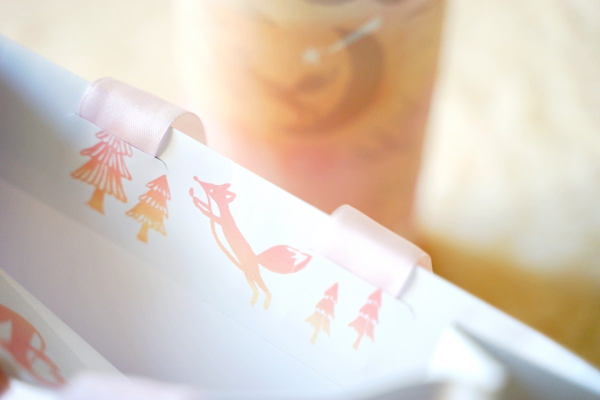 除了特製禮盒,還有特製紙袋,與小狐狸禮盒搭配好一組的紙袋,紙質與設計都很有質感,一看就知道不一樣。內層也有小狐狸的童趣繪圖,配上淺粉色的緞帶,是充滿喜悅與幸福的顏色。