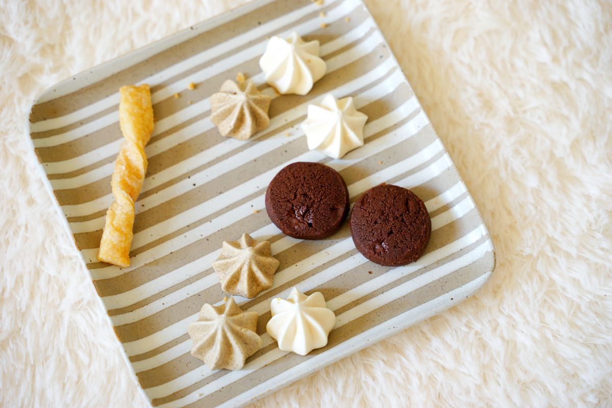 綜合蛋白霜、千層酥條、巧克力酥餅,基本上手工餅乾該有的,晚安點心坊也都有,但口味與用料實在不同。千層酥條做螺旋造型,卡滋脆口。綜合蛋白霜有錫蘭法式蛋白霜與金箔法式蛋白霜兩種風味,蛋白霜香黏的口感,甜度與香氣恰如其分,每當我吃到差一點要膩的時候,就在嘴裡全化開了,像是鬧脾氣的女孩,差一點就要讓另一半暴走時,又開始撒嬌,讓人怎樣也氣不了。而巧克力酥餅我自己非常喜歡,苦甜的風味、香脆又柔軟的口感,完全抓住我的味蕾,是大人喜歡的巧克力味,像人生一樣,看似苦,但偶爾又來點甜,充滿層次的精彩。