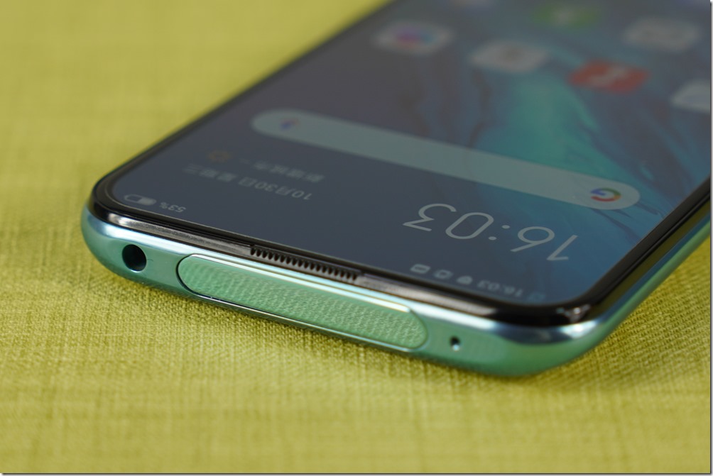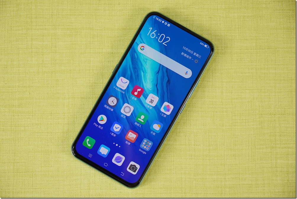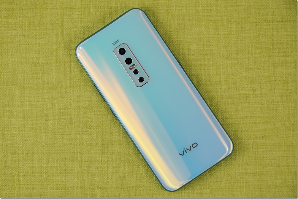 外型設計上,由於採用升降式前鏡頭設計,因此正面為全螢幕,沒有瀏海或是挖孔阻礙視線,機背也是獨特的琉璃白選色,隨著光線角度不同,會反射出不同色彩的琉璃光,加上置中設計的四主鏡頭模組,整體看起來左右對稱,拿起來的手感也很不錯。