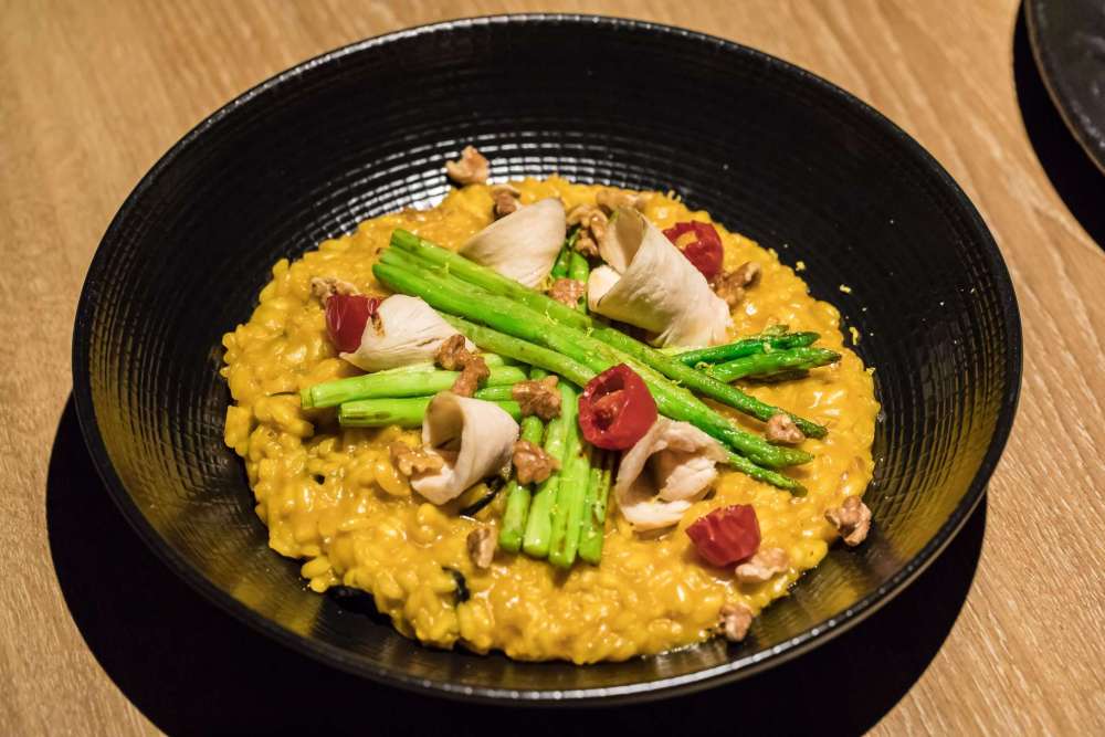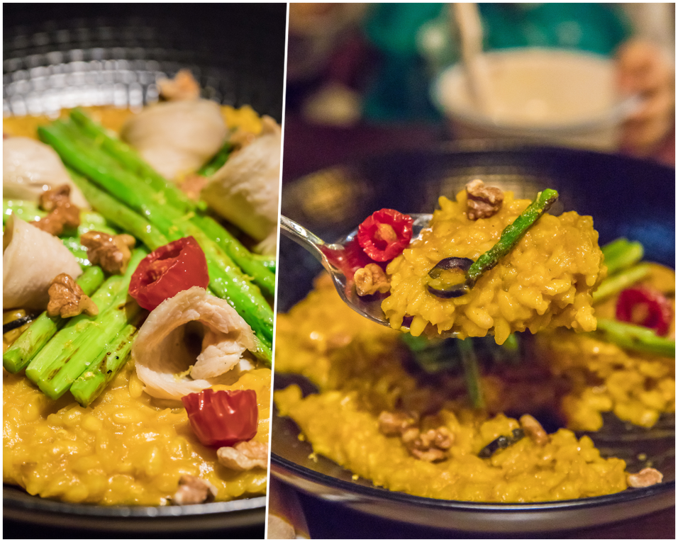 用南瓜跟低溫烹調雞胸肉,搭配義大利米做成的雞肉南瓜燉飯(400元,份),光是用看的就非常逼人,再加上頂部還搭配溫最愛的蘆筍跟小番茄,才一上桌溫溫就叫個不停!