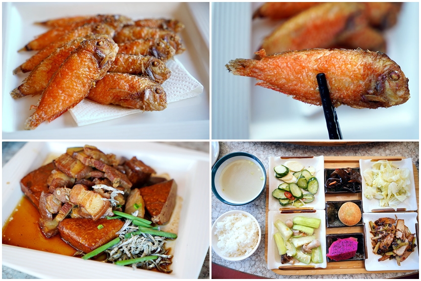 ▼炸紅新娘,這是澎湖特有的海魚,小小的一尾很可愛,通常以酥炸的方式呈現,第一次品嚐,看似沒肉,咬下卻意外有細緻且鮮甜的美味,肉還不少呢! 搭配一點胡椒鹽提味也不錯! (左下圖) 漁夫式滷肉,口味稍甜帶著些許海味,滷汁非常下飯的一道菜。(右下圖)素食的朋友在這裡也會提供個人素食套餐。