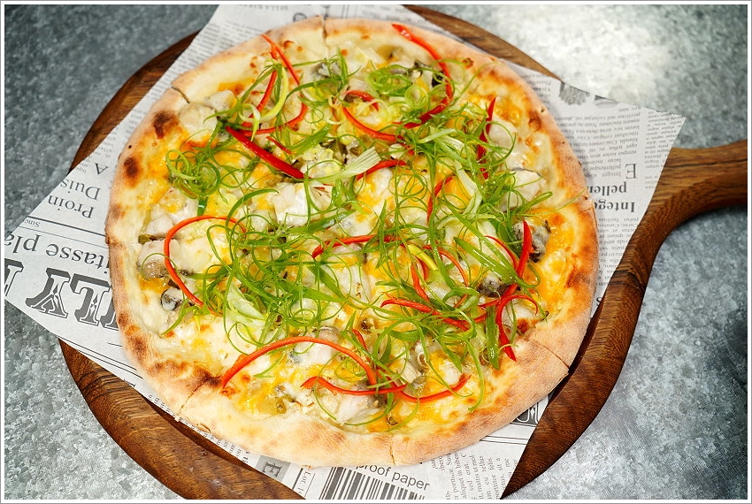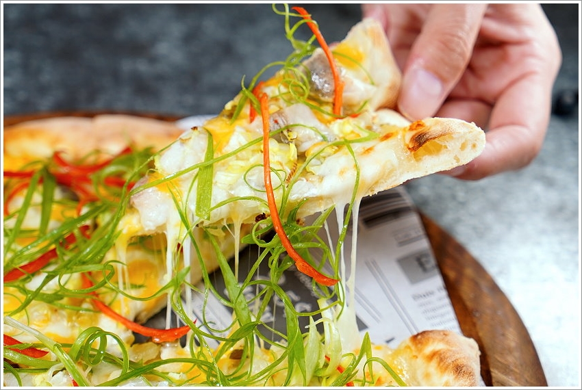 ▼新菜色”蔥味越瓜鱸魚披薩”,選用了望安鄉的越瓜,也就是在地人說的酸瓜仔,用炒過的酸瓜與海鱸魚中西合併來搭配,上頭的青蔥裝飾讓比薩視覺都立體了起來,老闆的用意是藉由這道菜色保留澎湖在地古早味,同時能讓異鄉遊子與在地人回憶起記憶中ㄚ嬤的味道。