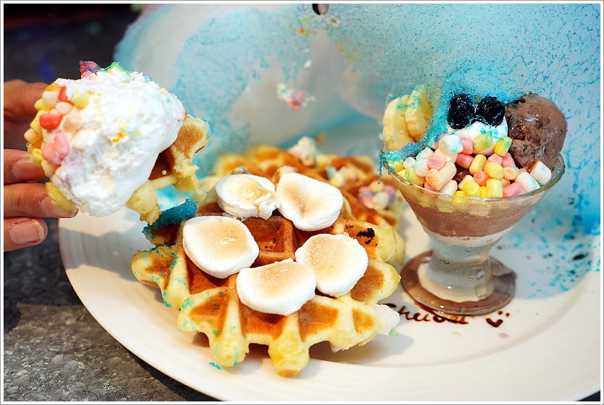 ▼底下的鬆餅也是採用店家自製的鬆餅粉來製作,口味與配料既夢幻又華麗呢!