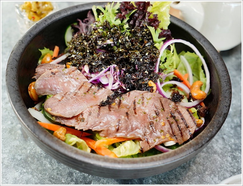 ▼板腱牛肉沙拉,有五種醬料可選,這天搭配了泰式紅椒檸檬醬,而這道菜更加入了澎湖的海菜做搭配,煎得軟嫩恰到好處的板腱牛與清爽的檸檬醬沙拉搭配真是太好吃了!