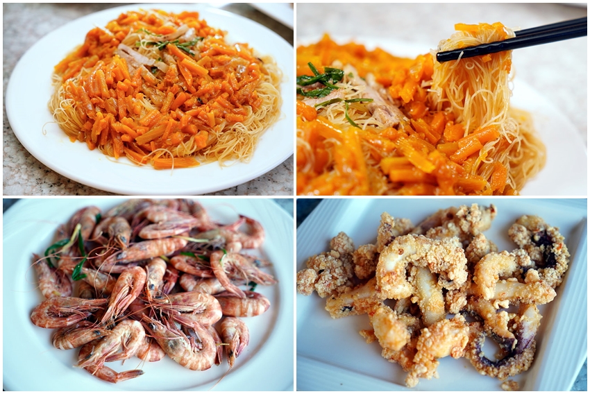 ▼南瓜又綿又甜搭配米粉可真是美味極了! (左下圖)在地人稱狗蝦,其實就是我們在台南比較常見的火燒蝦,簡單川燙後上桌,直接吃也很不賴~ (右下圖)這可不是什麼阿根廷大章魚,是正港的澎湖炸花枝,鮮甜好味,吃了會上癮!