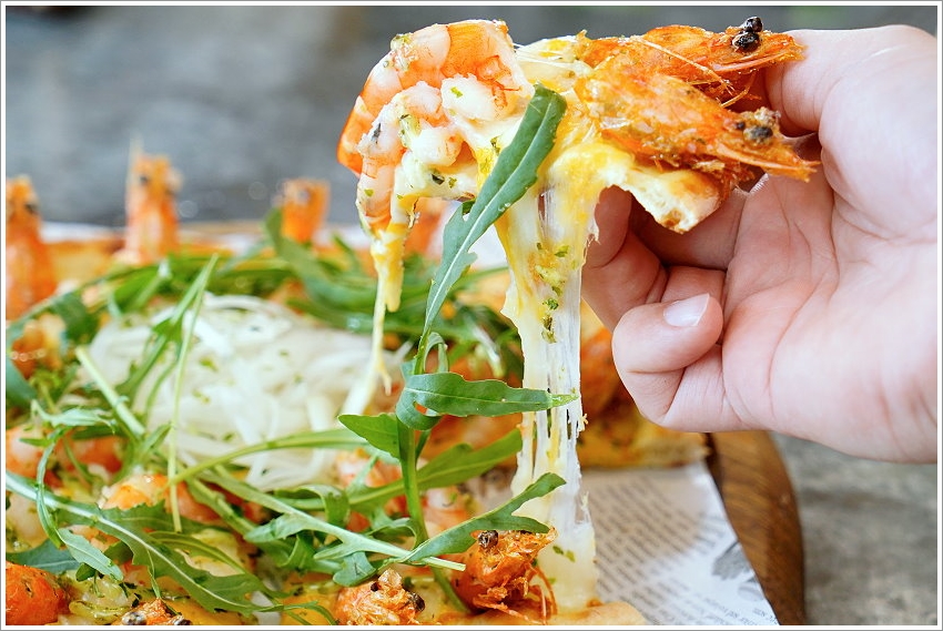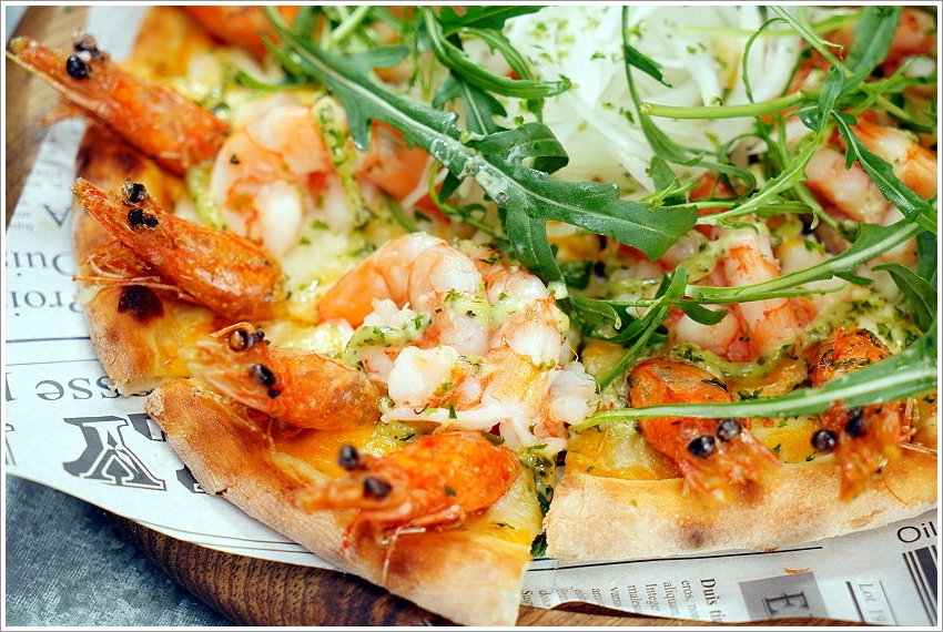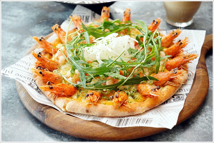 ▼當天我覺得最好吃的青醬鮮蝦Pizza ! 這豪華版共有16隻白蝦,也就是每一片比薩上填滿了2隻蝦子!