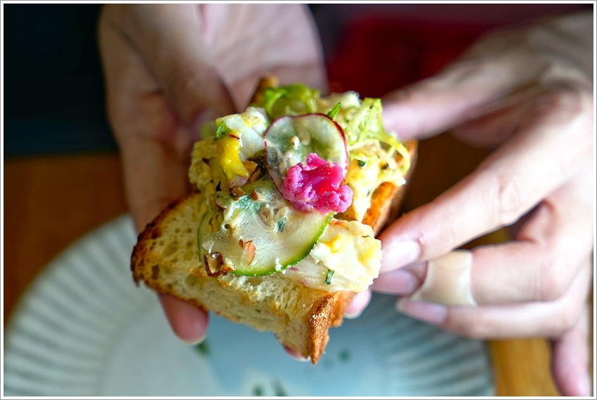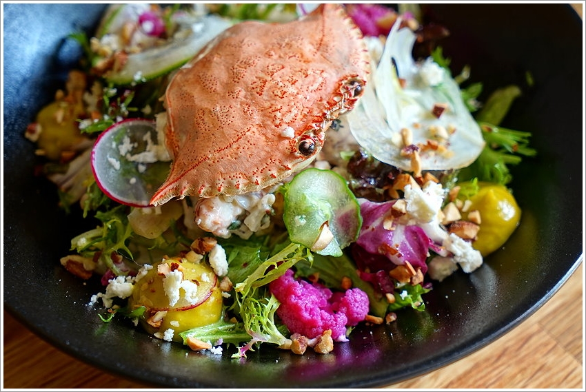 ▼蟹黃炒蛋搭配香料馬鈴薯丁及蟹管肉,這道菜名就跟它的配料一樣豐富,複雜卻又好吃得讓人飛上天! 當天我最愛的料理就是它了! 紫蘇蒜片拌蟹管肉、蟹黃奶油攪炒蛋、蒜味迷迭香馬鈴薯丁、酪梨泥、生菜、綜合堅果全部搭載一起,總想要一次把它的味道吃個清楚,卻又被細部組合的食材給吸引,例如我喜歡蟹黃炒蛋拿去沾酪梨泥,嚇死人的美味,最後清盤的也是我~ 哈!