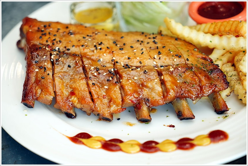 ▼蜜汁炭烤辣味小肋排,看似簡單的烤肋排,卻也相當費工,豬肋排切除多餘的油脂再去膜後,把肋排泡入自製醃料蓋過肋排再用保鮮膜貼面,放入冷藏24小時後,用清水沖洗乾淨,接著放入烤箱燜烤,燜烤過程中分次刷上特製的蜜汁辣醬烤至上色入味,另外附上肋排燜烤過的肉汁,可以沾或淋上肋排增加層次與口感!!