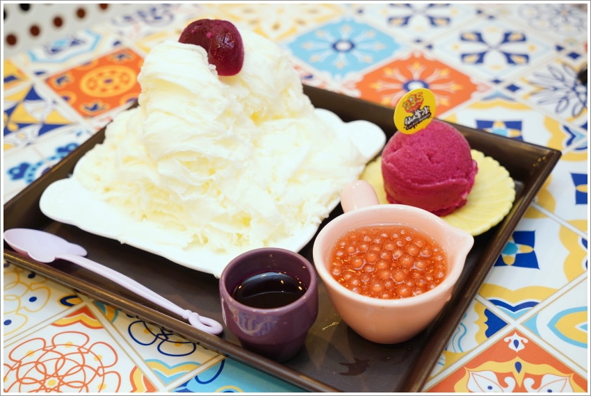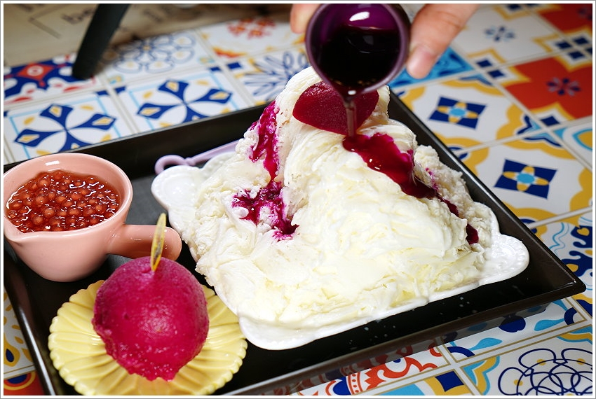 ▼底下使用純牛奶製成的綿綿冰,這道冰品漂亮又好玩,一開始要先將仙人掌汁倒入~