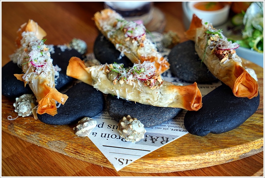 ▼酥烤珠螺奶醬捲,一開始就是這款奶醬捲吸引了我的目光,因為擺盤美、色彩明視度又強烈,食材搭配澎湖在地的珠螺、高麗菜酸,一口咬下口感輕鬆酥軟,高麗菜酸與帕瑪森起司完美結合,帶點堅果香氣讓人喜愛!