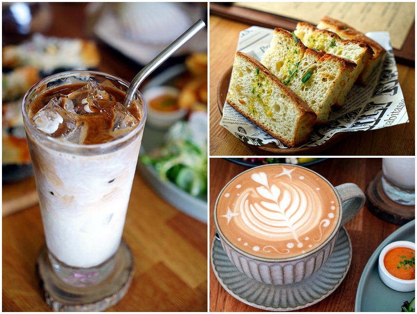▼自製香料佛卡夏是與蟹黃炒蛋搭配香料馬鈴薯丁及蟹管肉這道菜做搭配一起享用的,另外點了冰的及熱的拿鐵,味道都在水準之上,尤其熱拿鐵的拉花非常細膩,我喜歡,哈!