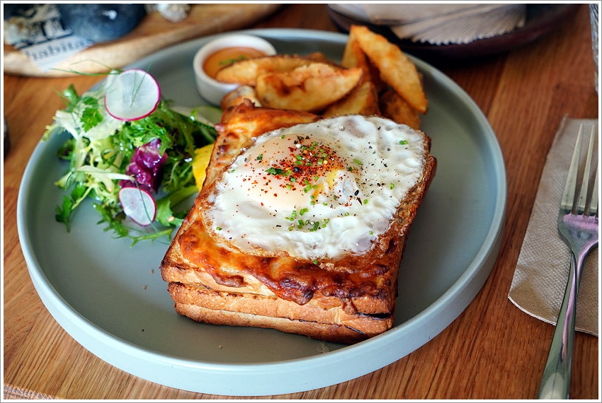 ▼公雞先生,乍看之下就是一個華麗的焗烤土司,裡頭包著自製培根、香料雞肉、法式芥末籽白醬與起司、生菜的豐富配料,早午餐能吃到這個好滿足!