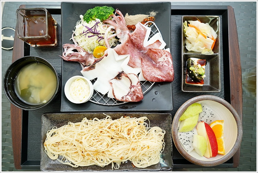 ▼結合澎湖特產小管及日曬麵線的小管乾拌麵,來這裡也可以吃到在地新鮮小管,套餐除了小菜、湯品外,一旁還附有海燕窩甜點喔!