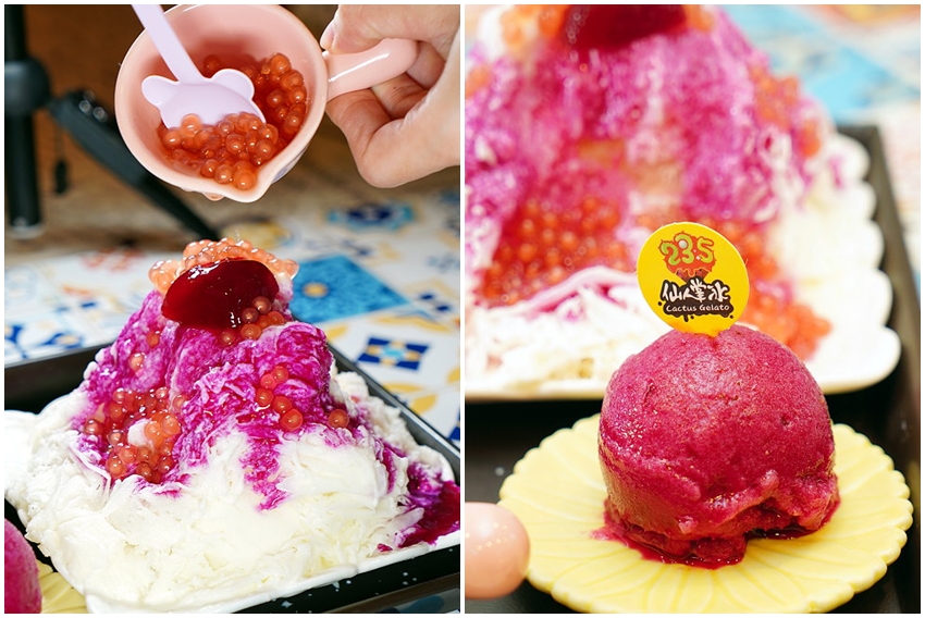 ▼接著是仙人掌珍珠~ 又Q又有咬勁的珍珠與綿綿冰搭配真是太好吃了! 微酸的仙人掌汁與甜口味的綿綿冰好搭,一旁還有一球仙人掌義式冰淇淋,老闆娘說為了要做成與眾不同100%的仙人掌義式冰淇淋,當年她帶著仙人掌汁到販售機台的工廠一家一家的拜訪試做,因為她想做的是不加其它成份的純仙人掌冰,因此幾乎市面上所有機台都無法順利製作,最後終於被她找到一家適合的,也就有了今天的美味仙人掌冰!