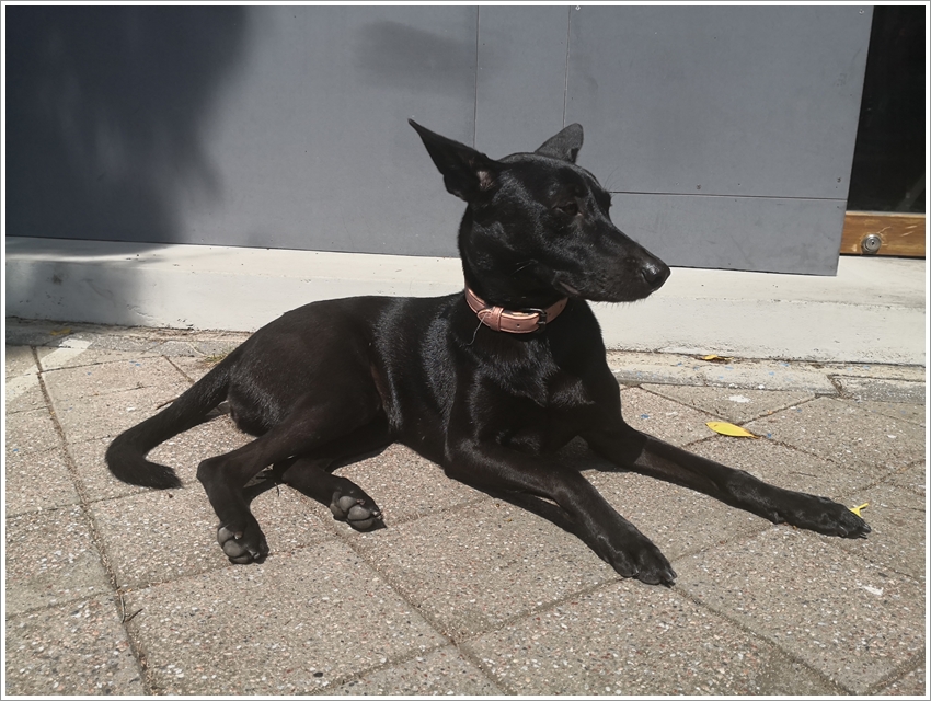 ▼餐車前的小黑狗現在正在店面門口慵懶的享受日光浴呢!