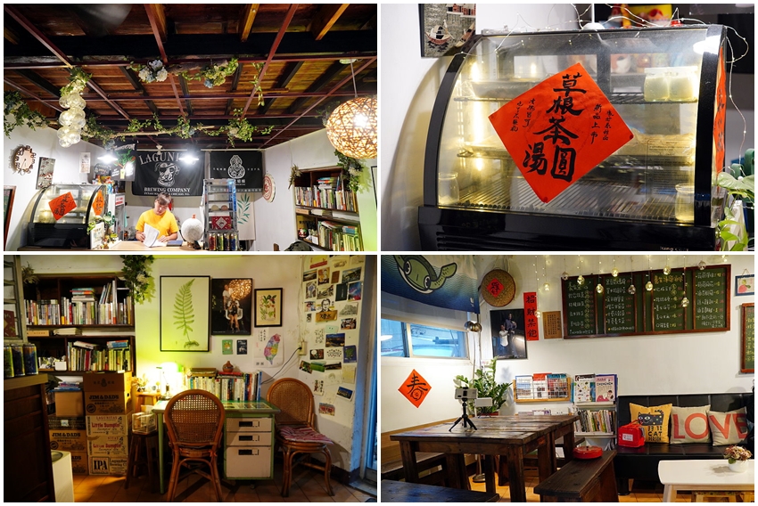 ▼(左上角)當初找了這個店面,為了拉電線把天花板拆掉,後來乾脆就直接讓木質部份以原貌呈現,老闆帶著微笑跟大家聊到,對於自己創立的空間有很多的想法。(右上圖)寫著草根茶湯圓,大家有沒有覺得很眼熟,跟文章最前面介紹的癮餐車廚房前”誰敢催菜”筆跡是不是很像,因為這都是出自於草根果子老闆的巧手,老闆說自己對書法也喜歡,店內空間不大,一旁書桌上整排的書都是他最近感興趣研究的內容。(下兩圖)來店的客人如要內用,這裡很隨興的,可以找店內任何的位子來坐,就連書桌前也是可以喔!
